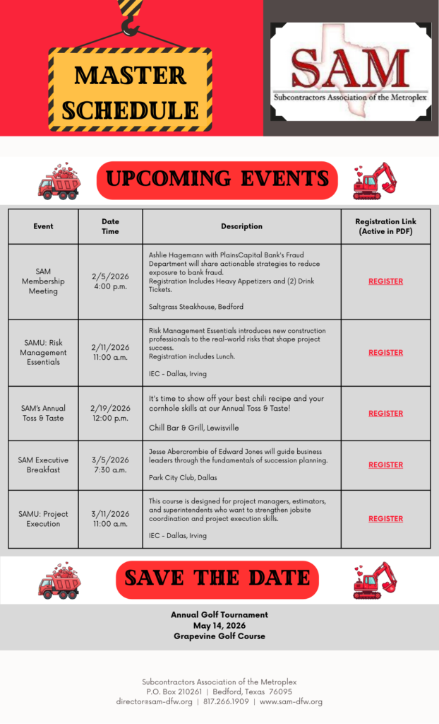 The Subcontractors Association of the Metroplex provides commercial trade subcontractors with the tools needed to achieve their business goals through the exchange of information, market awareness, educational opportunities, fellowship and mentorship.